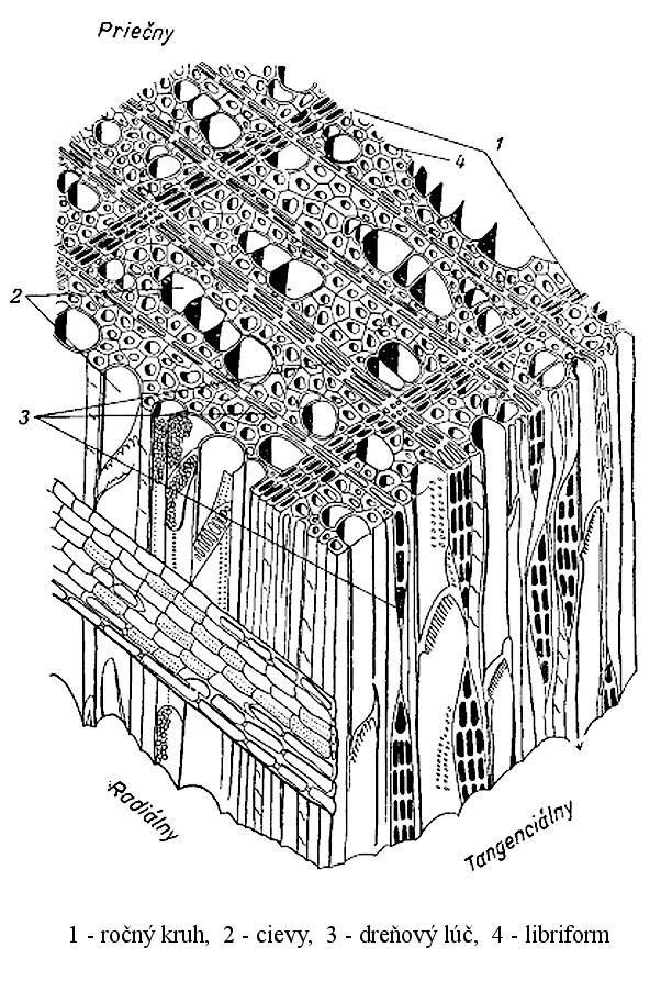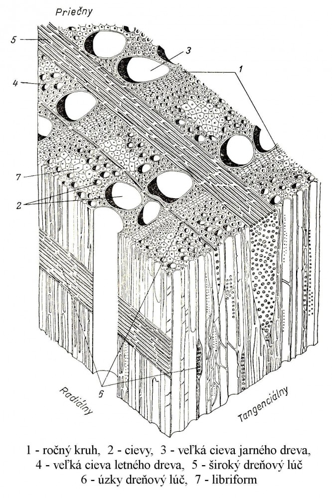 schéma mikroskopickej stavby dubového dreva (viď obrázok)