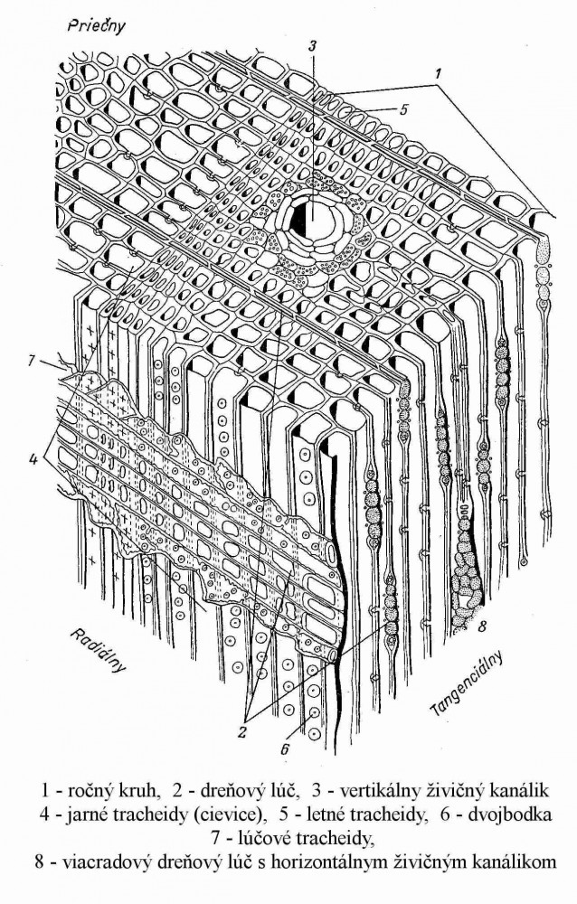 schéma mikroskopickej stavby borovicového dreva (viď obrázok)