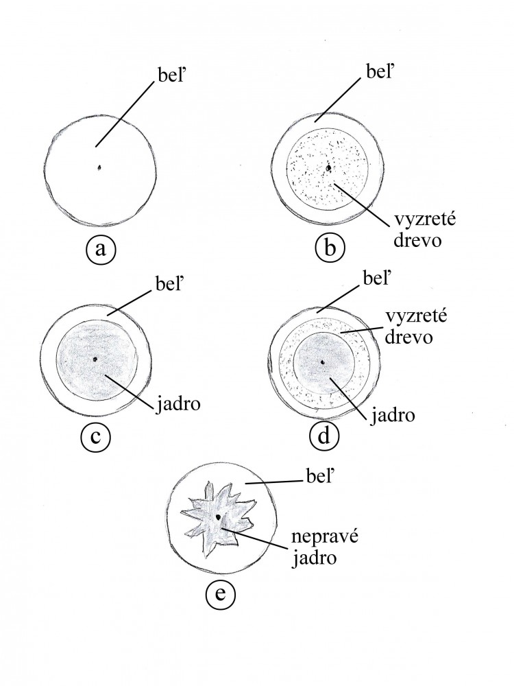 3. bezjadrové dreviny s výskytom nepravého jadra (buk lesný, javor horský, breza previsnutá, breza biela, ...)